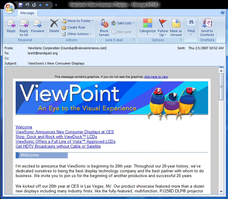 When I open Outlook to ready my email, the first two things I notice are the recipient and subject of the email. Check out the email below which I received from Viewsonic. They probably got my email address off a mail in rebate from a Viewsonic LCD monitor I purchased last year. Now, every so often they spam me.