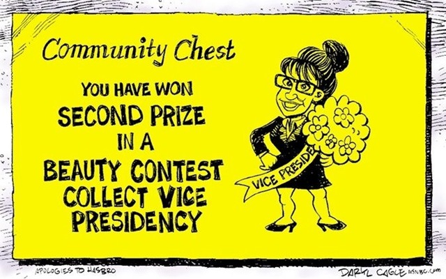 Here’s my favorite of the numerous Sarah Palin cartoons found at MSNBC. Each day we find out something new about McCain’s choice for VP that’s more fitting for Entertainment Tonight than a national election. Now McCain tells us he’s sent a team to Alaska to look into Palin’s background in more detail. Shouldn’t have he done that before he thrust her onto the national stage?