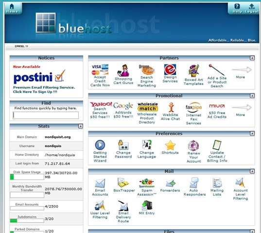 CPanel is the place you go to install WordPress along with keeping tabs on your site and a bunch of other stuff related to your account. I’m assuming you’re using Bluehost but most hosts have similar looking control panels. Follow the link in the email you received that will also include a username and password. At Bluehost the login is in the upper right corner and it asks for your domain and your password. Type both in and you should be taken to the Control Panel which looks like this: